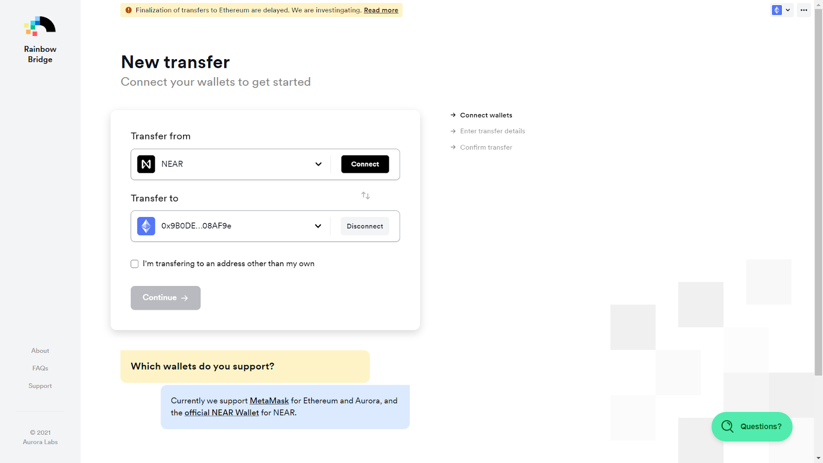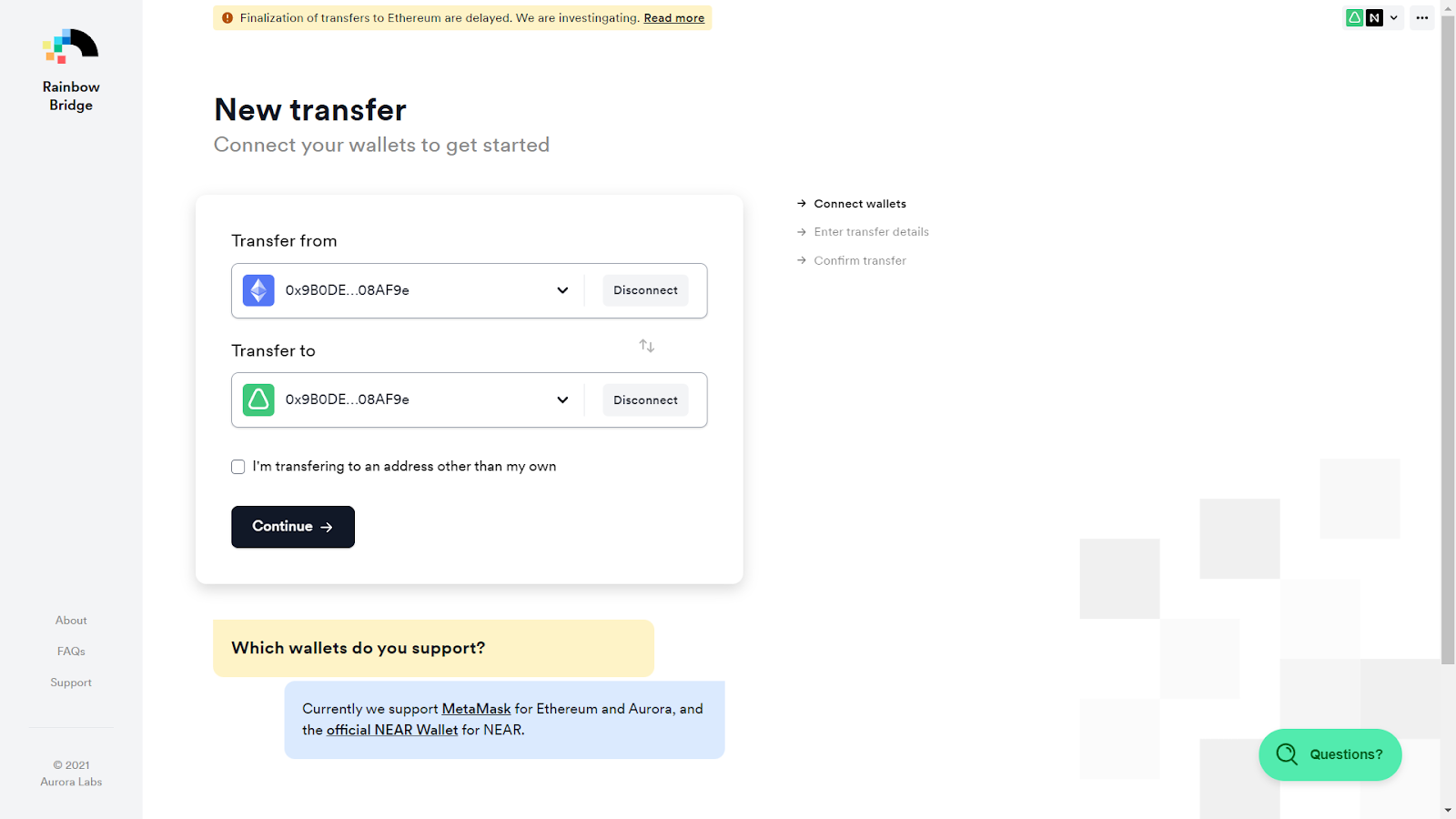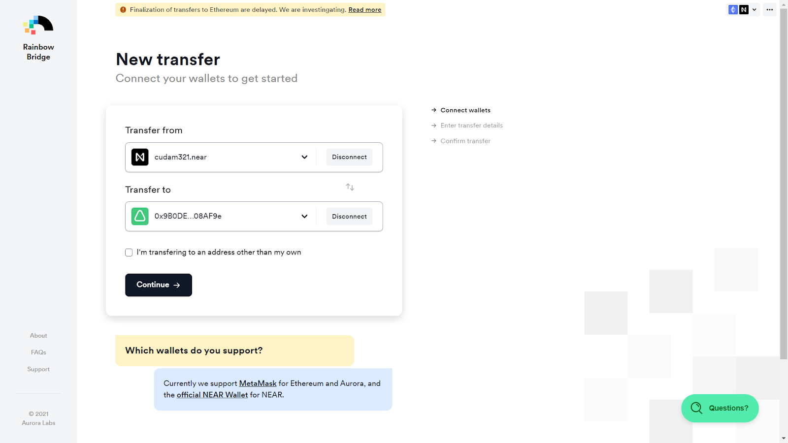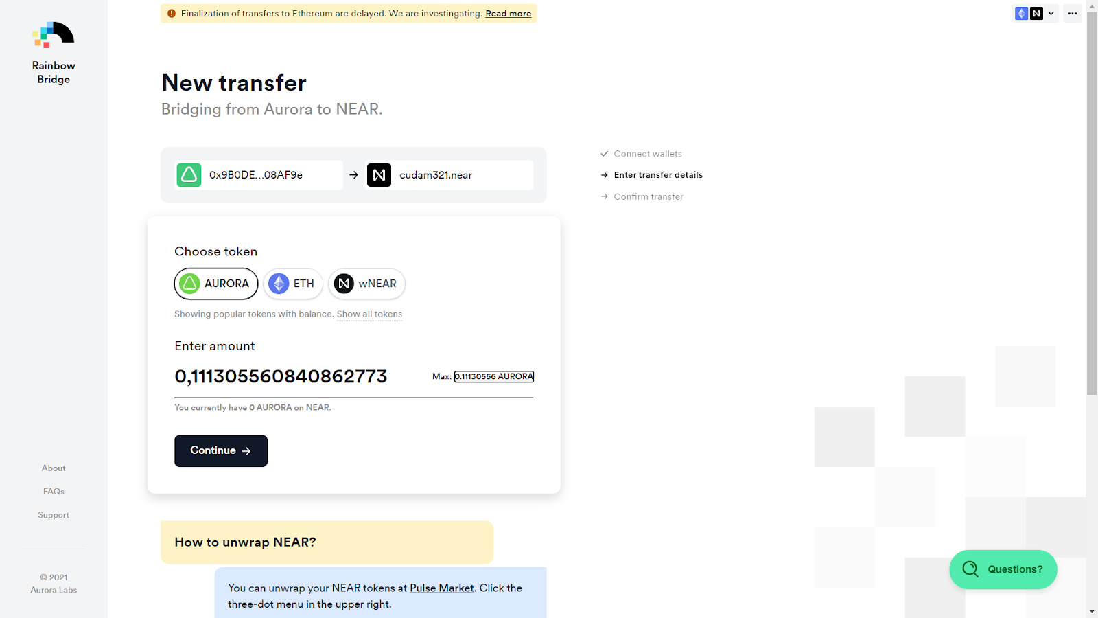 3. Choose your asset and the amount that you want to transfer, hit Continue then Confirm. Note: Transfers between Aurora and NEAR are very low cost, typically a few cents. The fees will be charged from your Near wallet