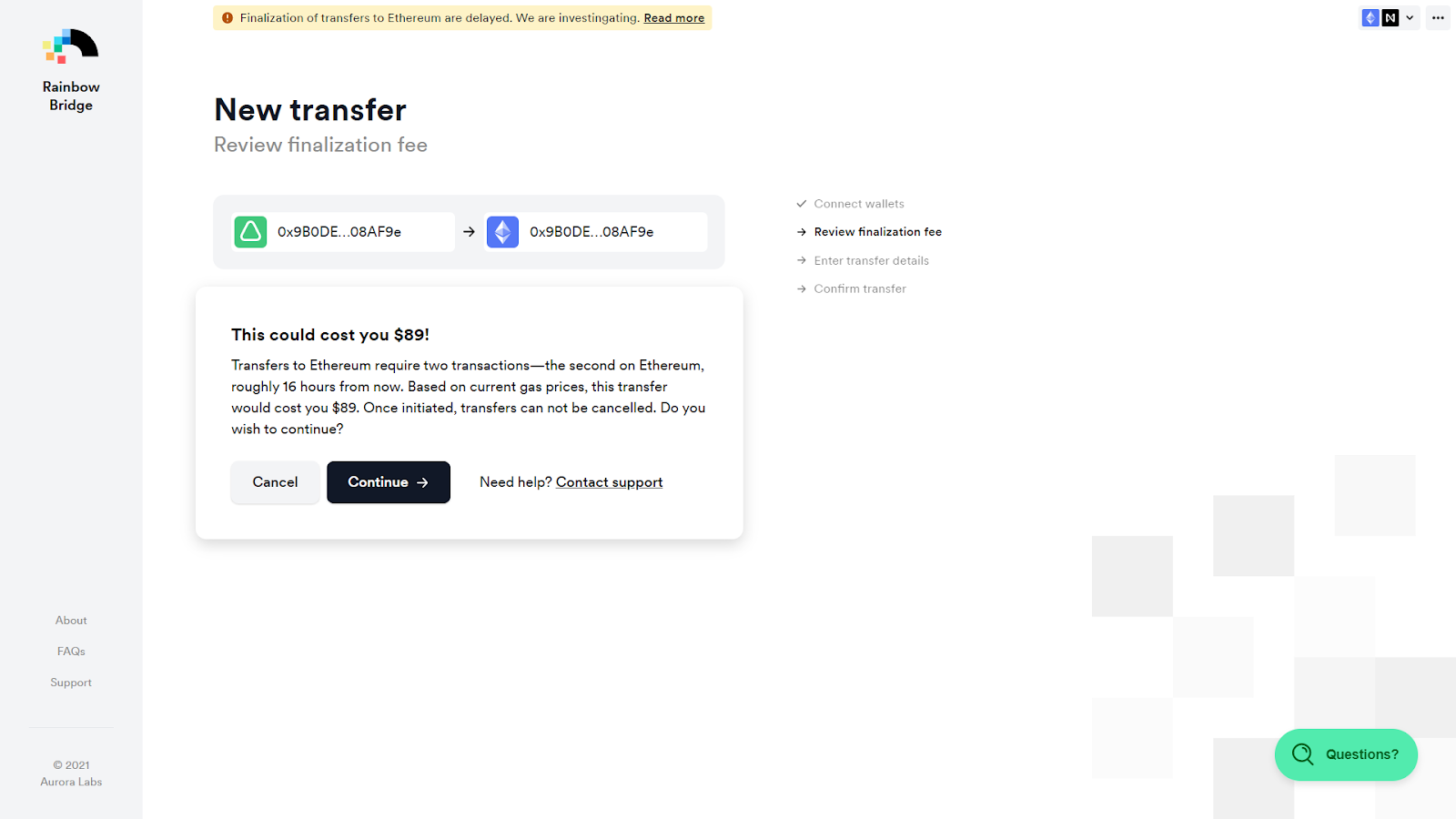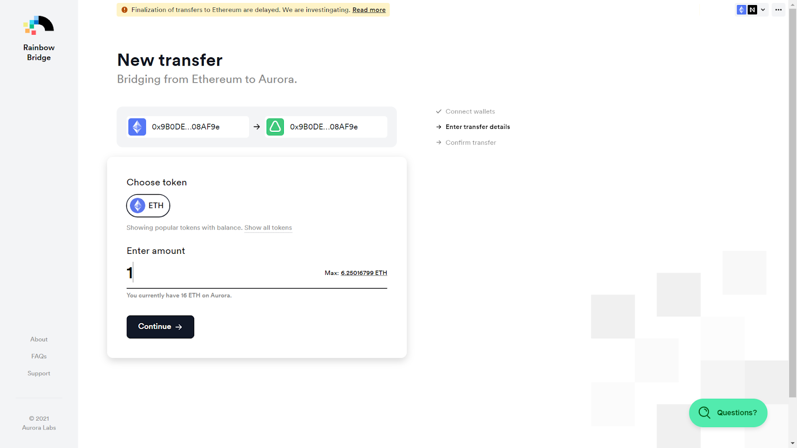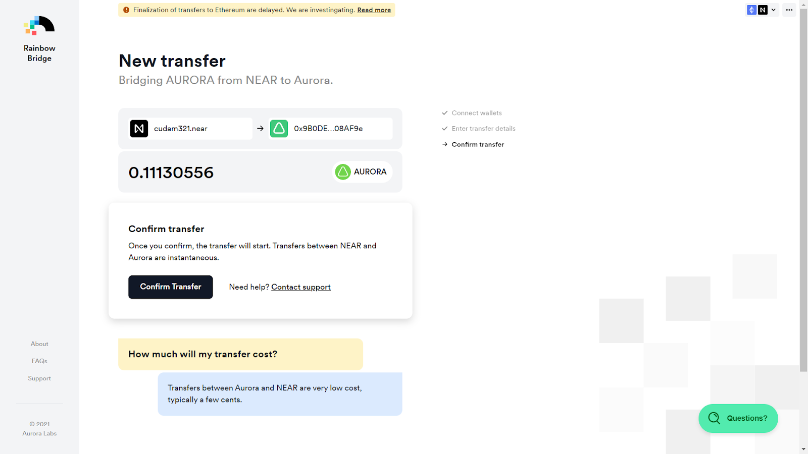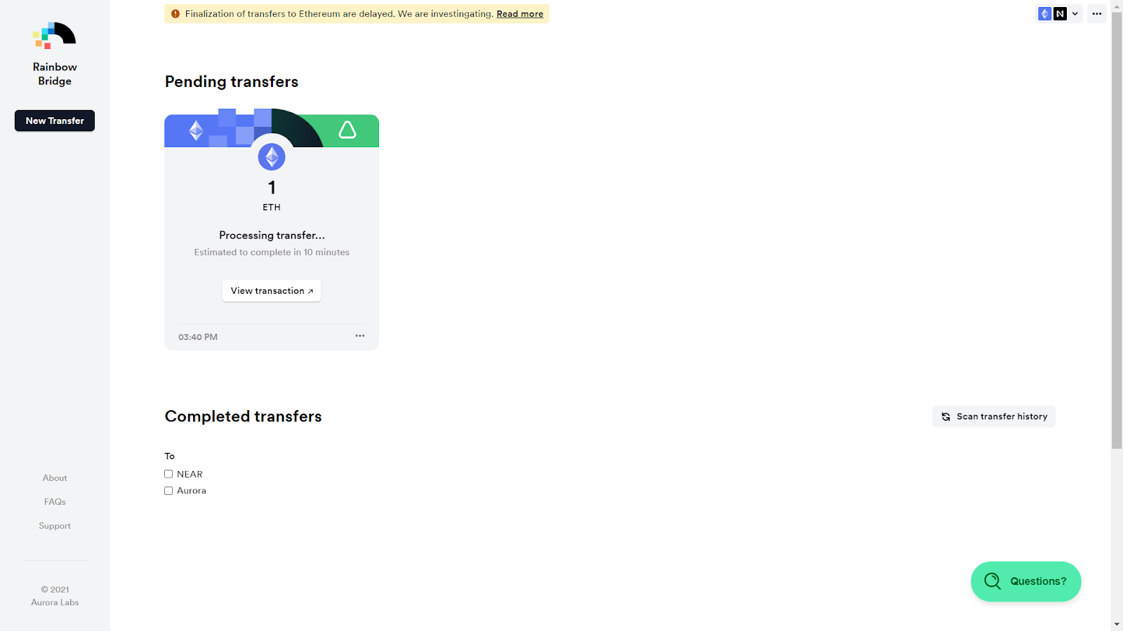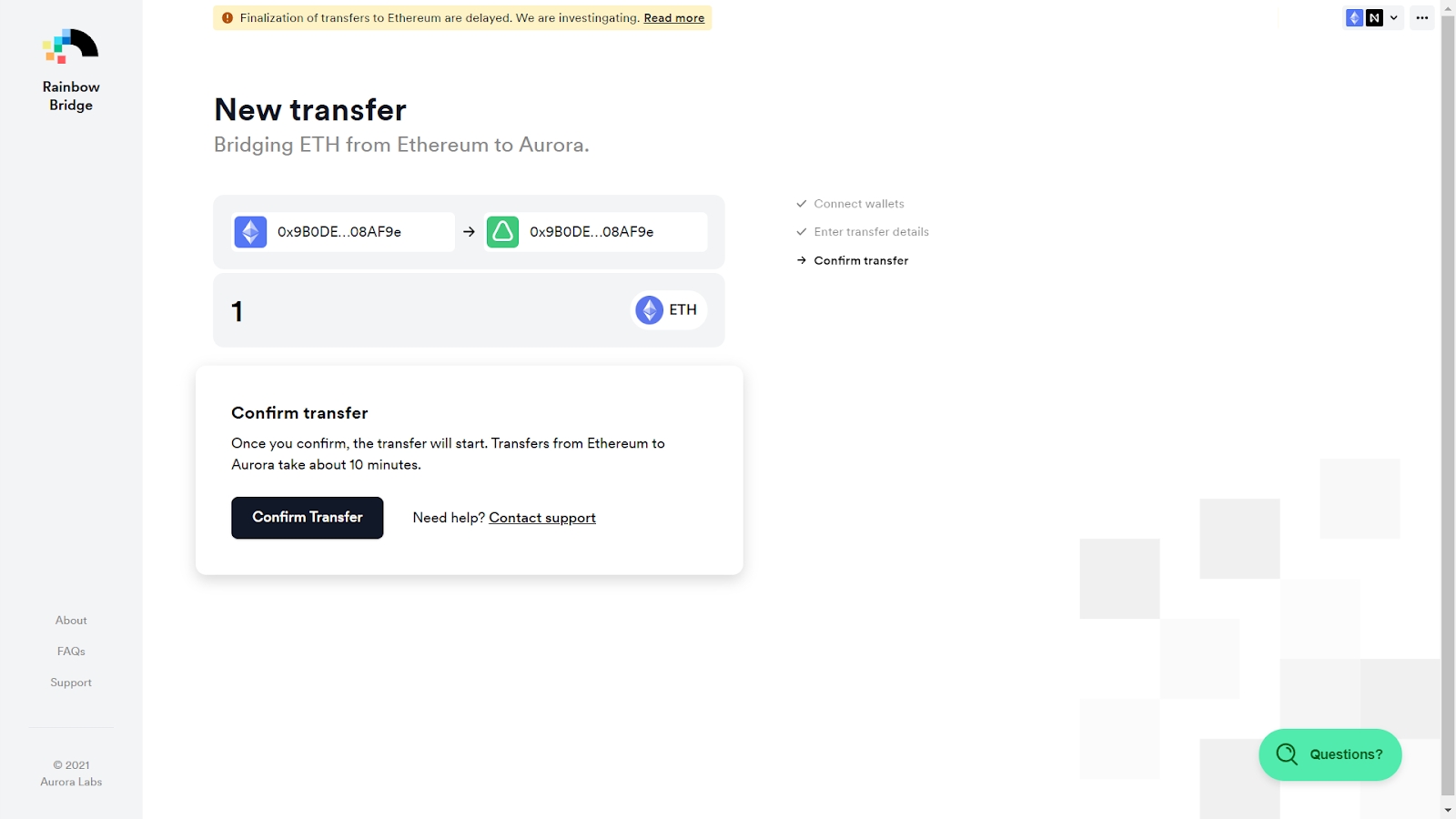 6. All you need to do now is sit back and relax until the transfer is completed. Transfers from Ethereum to Aurora take about 10 minutes.