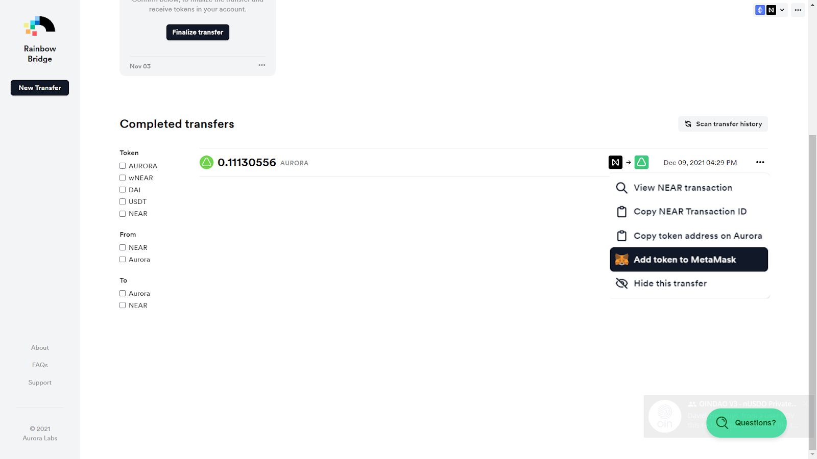 4. Transfers between Aurora & Near are instantaneous. After confirmed the transaction in your Metamask, you’ll see your transfer is listed as Completed