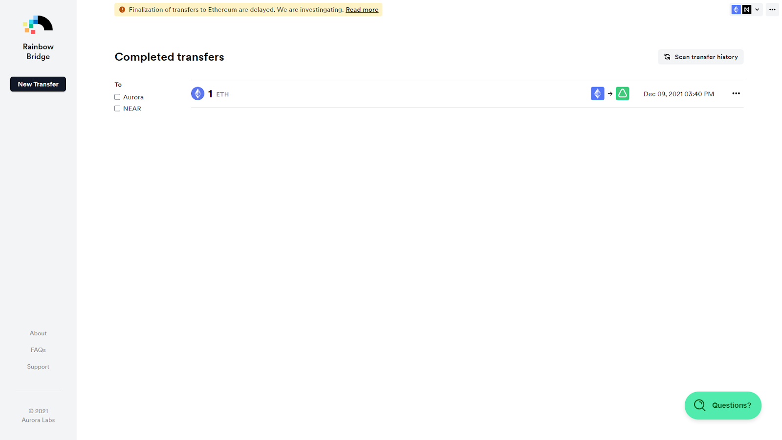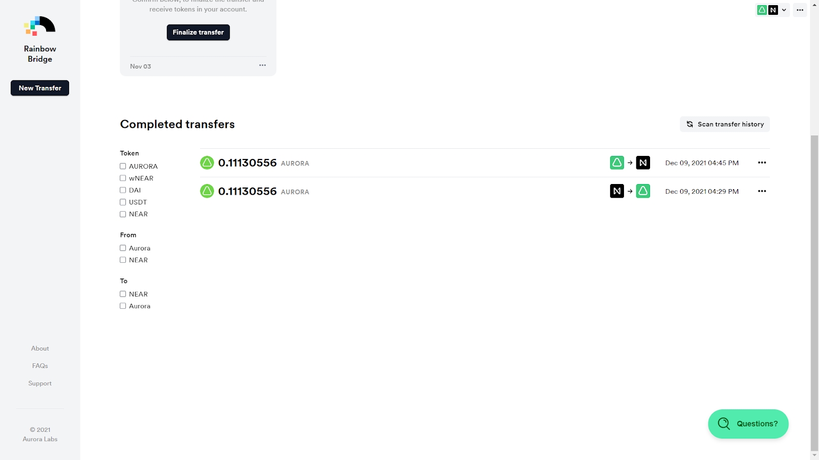 5. Transfers between Near & Aurora are instantaneous. After the transaction, you’ll be redirected back to Rainbow Bridge and see your transfer is listed as Completed