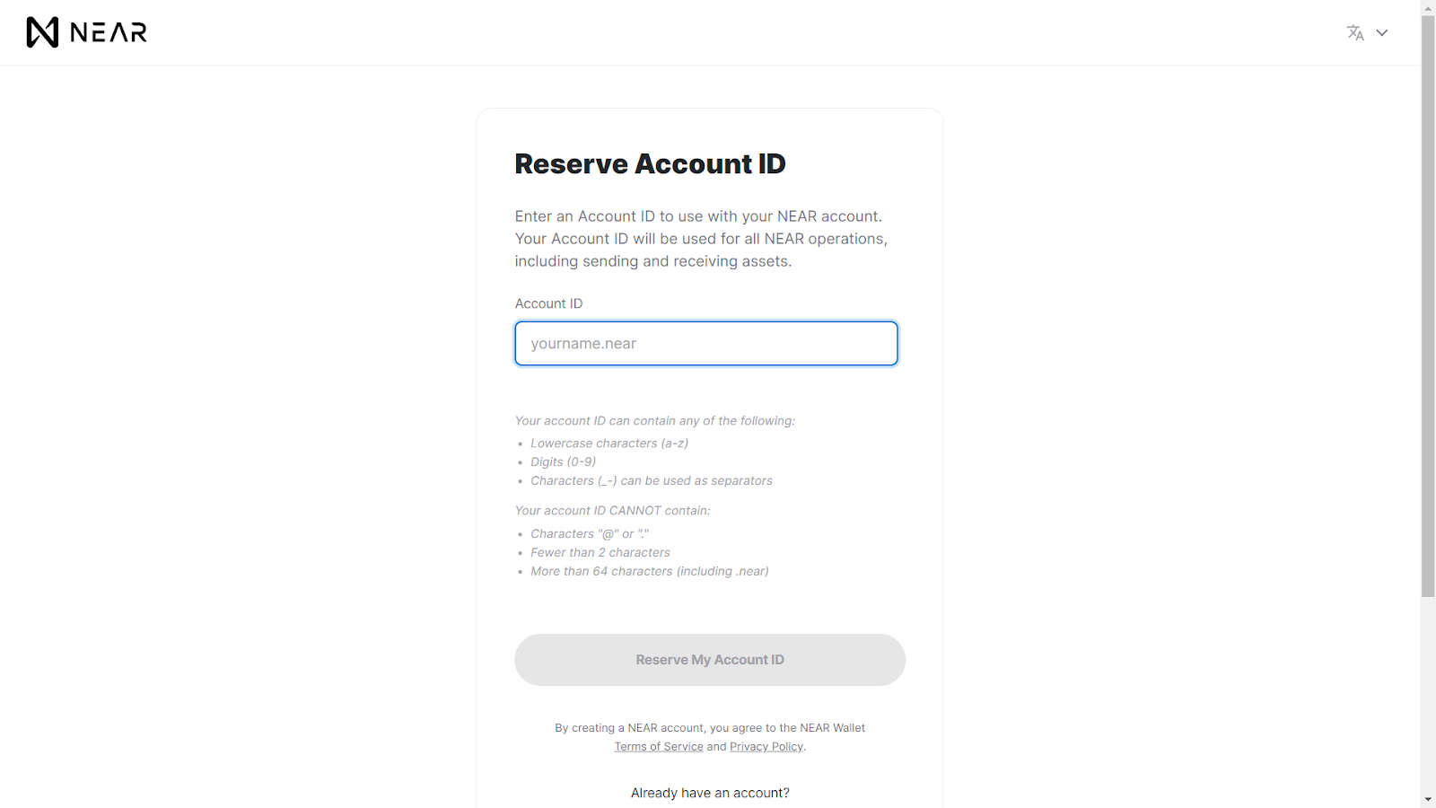 Characters “@” or “.”|Fewer than 2 characters|More than 64 characters (including .near)